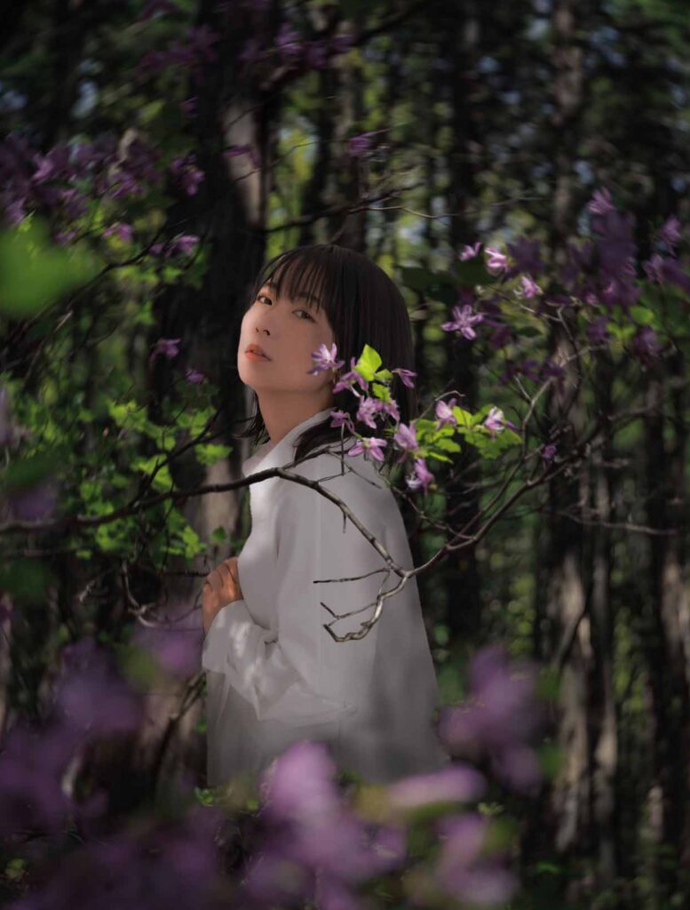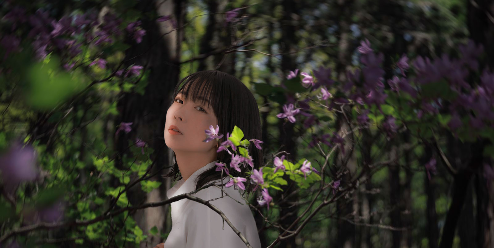 モデルが森の中にいるのを表現するため、枝や花を切り抜き手前に持ってきました。モデルに木漏れ日が当たっていることを表現するために追い焼けと焼け込みを使いました。全体にメルヘンチックな感じを出すために背景に放射状のぼかしをわずかに入れました。