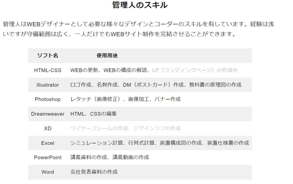 - portfolioサイトでテーマのカスタマイズを使用して、デザインを更新する。色やフォントサイズ、backgroundまで変更できることがわかった。これで、buttomを使わないでよくなった。また、ソフトウェアスキルを制作する。グラフにしても何ができるのかが分かりにくいと思ったので、実際に授業でやってきた内容を表にまとめることにした。