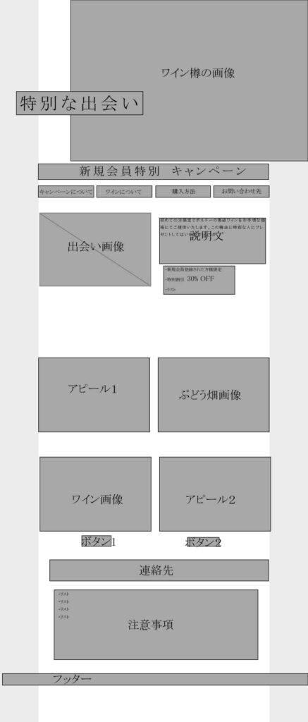 - 感想 Photoshopでワイヤーフレームを作っていたが、久々でPhotshopの使い方が分からなかった。レイアウトは後回しにして、先に枠組みだけ完成させる。